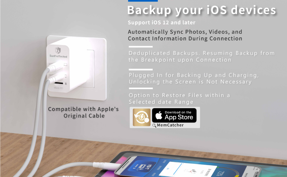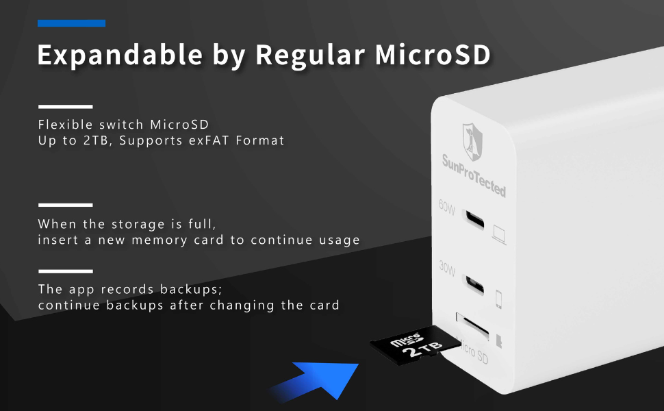- iPhone/iPad Auto Backup upto 2TB expendable storage via MicroSD : Automatically backs up camera roll, contacts, accounts, passwords, and secure notes directly from your iPhone/iPad while charging.